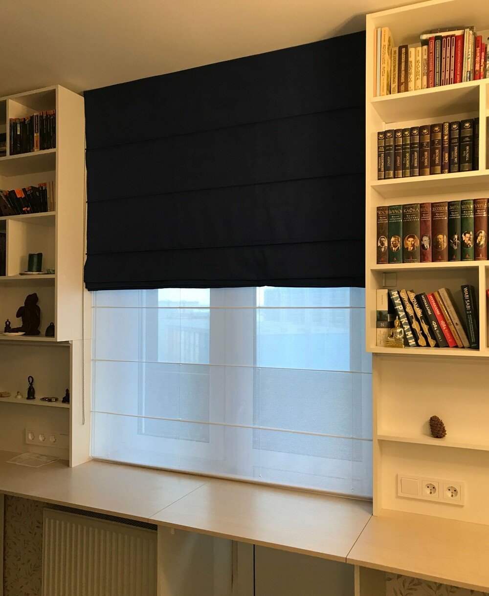 - Если нужна регулировка освещенности в течение суток, то лучше выбрать римскую штору день-ночь блэкаут с тюлем. Путем регулировки высоты двух полотен можно настраивать количество проникающего в помещение света.