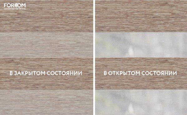 Полотно ткани, состоит из чередующихся горизонтальных полос – прозрачных и непрозрачных. Изменяя положение этих полос относительно друг другу, можно создать целых 3 режима регулировки светом. Например, чтобы в помещении стало светлее, нужно расположить прозрачные полосы друг напротив друга. Если разместить прозрачную и непрозрачную полосу параллельно друг другу, то можно добиться практически полного затемнения.